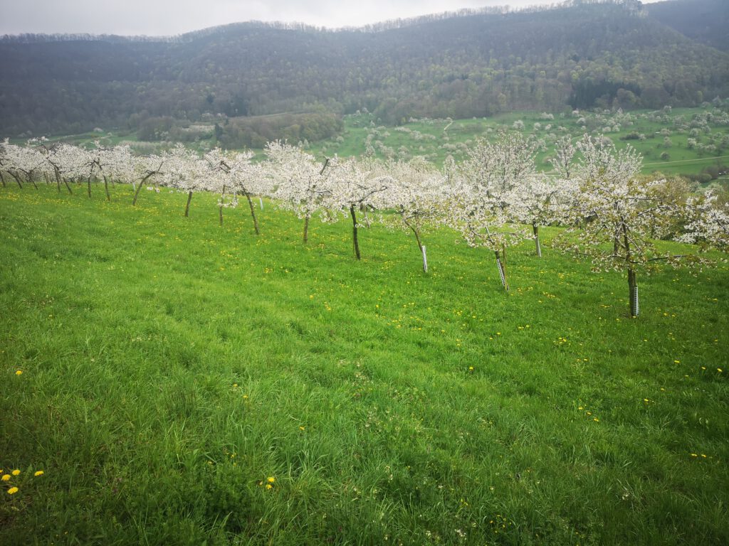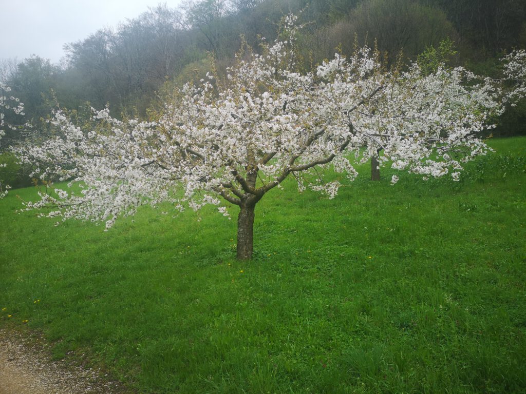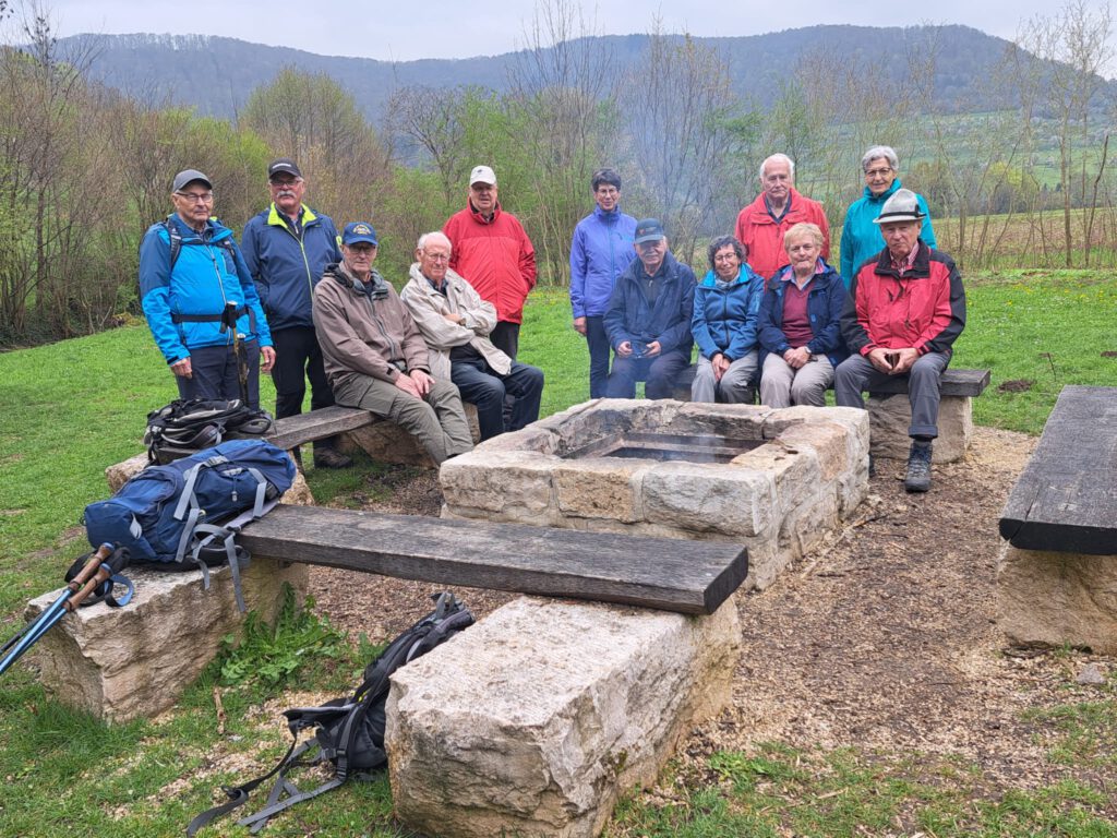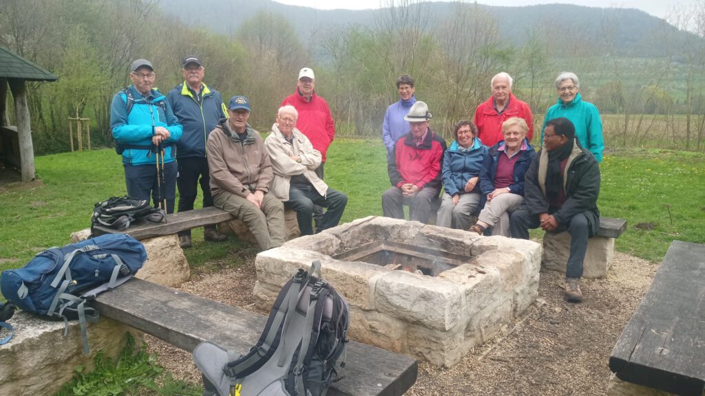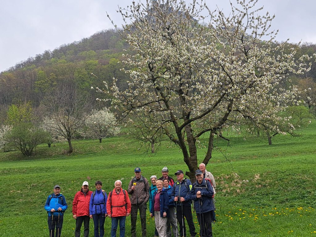 Über die Autobahn ging es zügig nach Weilheim zum Parkplatz Lindenbrücke zwischen Weilheim und Neidlingen. Wir gingen durch den Ort Neidlingen und kamen schon bald zu den blühenden Kirsch- und Obstbäumen rund um Neidlingen, die in Ihrer schönsten Blüte standen. Es war immer wieder ein wunderbares Bild, diese weiße Pracht bestaunen zu dürfen. Wie sagte doch jemand aus der Gruppe: „Heute ist so ein wundervoller Tag.“ Genau so einen habe ich noch nie gesehen von Maya Angelou. Immer wieder mussten wir vor dieser Blütenpracht innehalten. Nach ca. 2 ½ Stunden hatten wir dann endlich den Grillplatz an der Lindach am Waldrand erreicht. Drei ehemalige etwas betagte Ruhestandswanderer hatten schon ein schönes Feuer vorbereitet. Bald standen wieder alle um das Feuer und ließen ihre Roten oder Weißen im lodernden Feuer brutzeln, der Eine mag eine etwas Blasse, wiederum Andere möchten eine Schwarzwälder Wurst. Damit das Ganze auch etwas Stil hat, deckte Rainer den Tisch mit seiner neuen Tischdecke ein. Natürlich dürfen bei so einer Wanderung die kleinen Fläschchen Destillate nicht fehlen. Um dann noch einen Ausgleich zu schaffen, bringt Albert immer eine Guck voll Süßigkeiten mit. Am Ende der Mittagspause machten wir noch ein paar Gruppenbilder mit den Blütenwiesen und dem Reußenstein als Hintergrund.